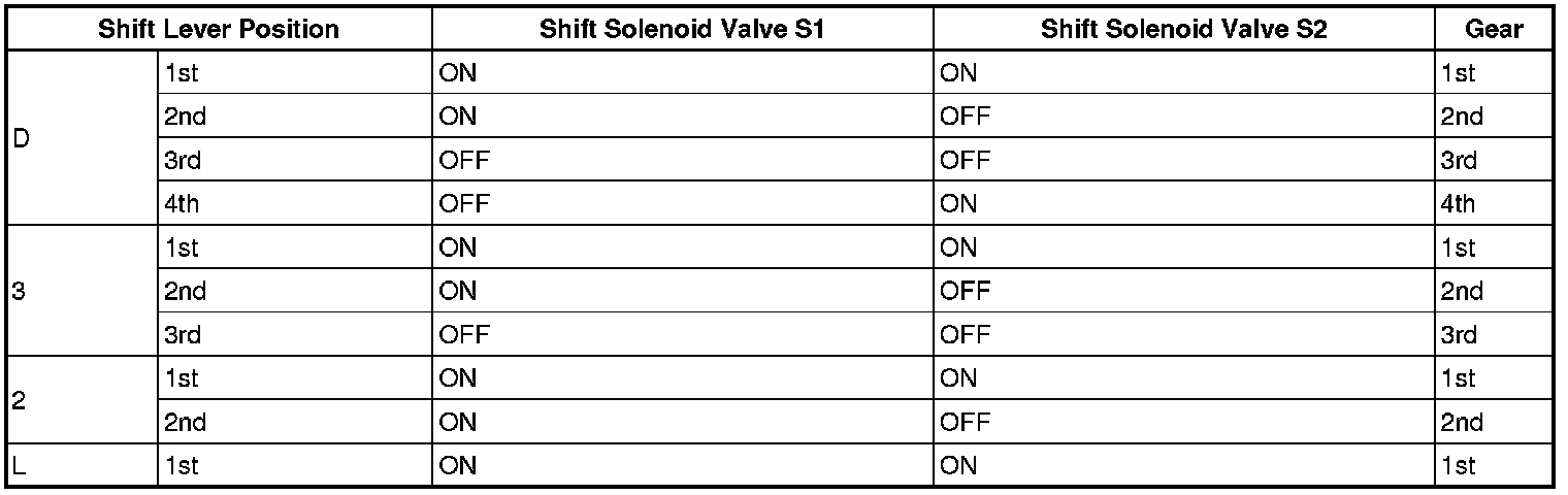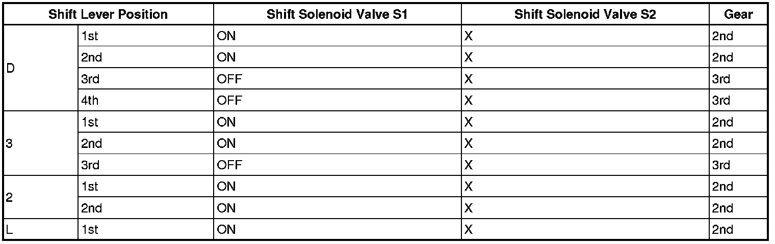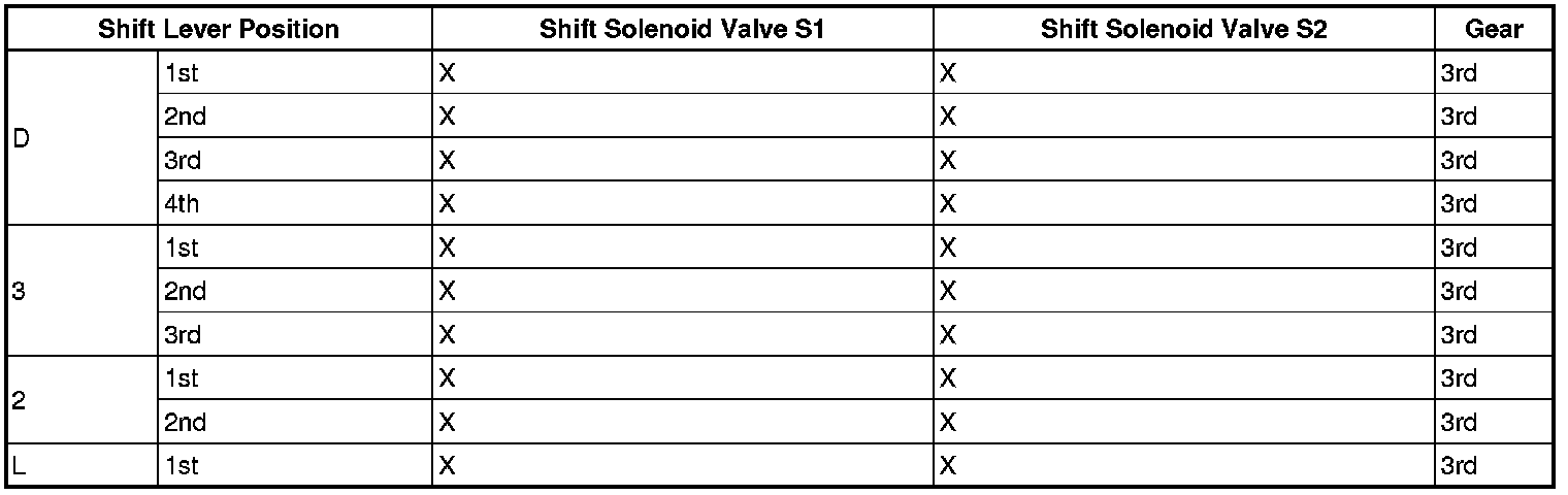 If either of the shift solenoid valve circuits develops an open or short, the ECM turns the other shift solenoid ON or OFF in order to shift into the gear positions shown in the table below.