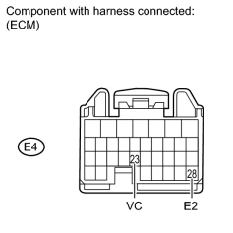 (2) Using a voltmeter, measure the voltage between connector terminals VC and E2 on the wiring harness side of the ECM.