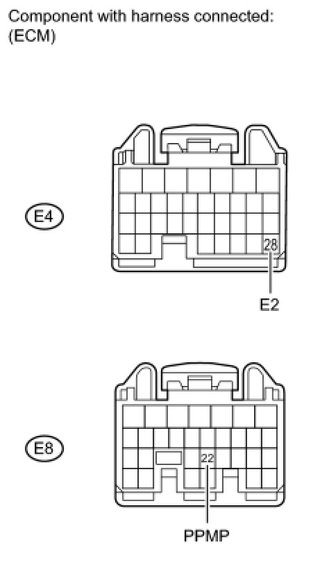(3) Using a voltmeter, measure the voltage between connector terminals PPMP and E2 on the wiring harness side of the ECM.