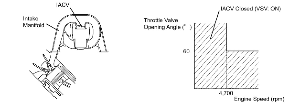 When the engine speed is 4700 rpm or more and the throttle valve opening angle is 60° or more, the IACV is open (VSV: OFF). At all other times, the IACV is closed (VSV: ON).