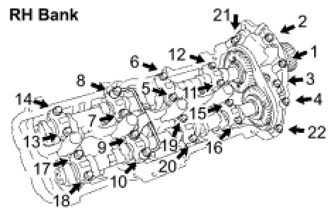 Uniformly tighten the 22 bearing cap bolts in several steps, in the order shown in the illustration.