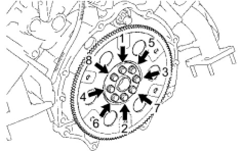 DRIVE PLATE & RING GEAR SUB-ASSEMBLYInstall and uniformly tighten the 8 mounting bolts in several steps, in the order shown in the illustration.
