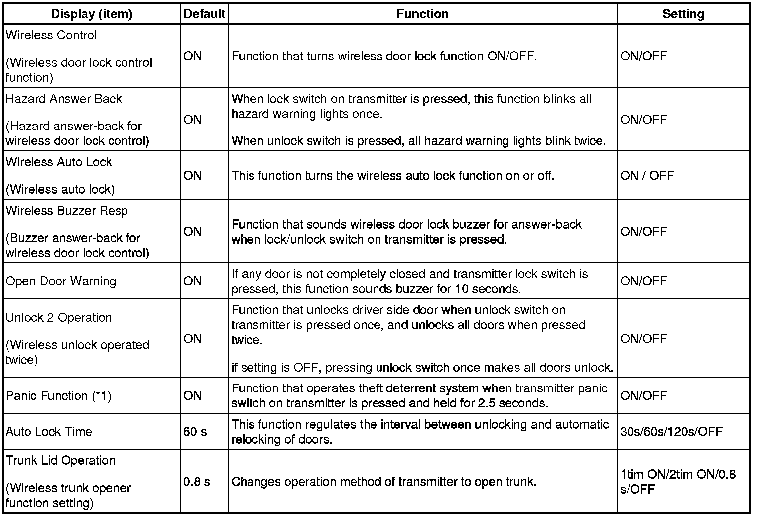 (*1): This function cannot be turned on or off if the security system is turned off.