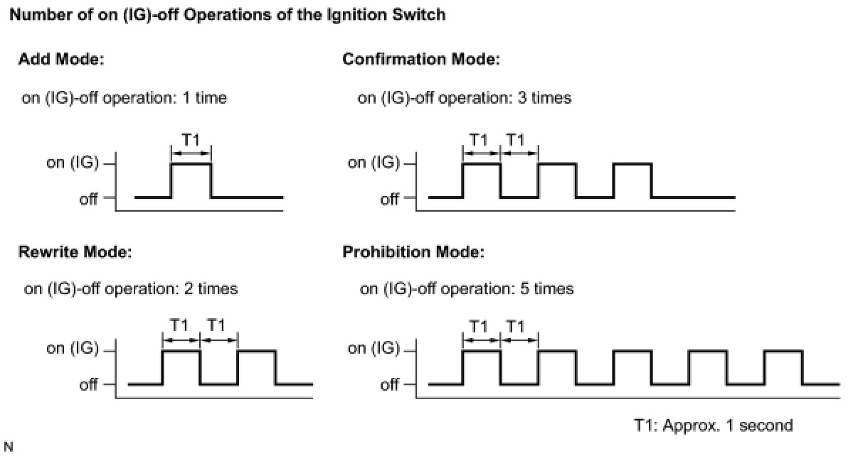 HINT: If the number of on (IG)-off operations of the ignition switch is 0, 4 or 6 or more, there will be no response (power door lock and unlock operation) to show which mode has been selected.