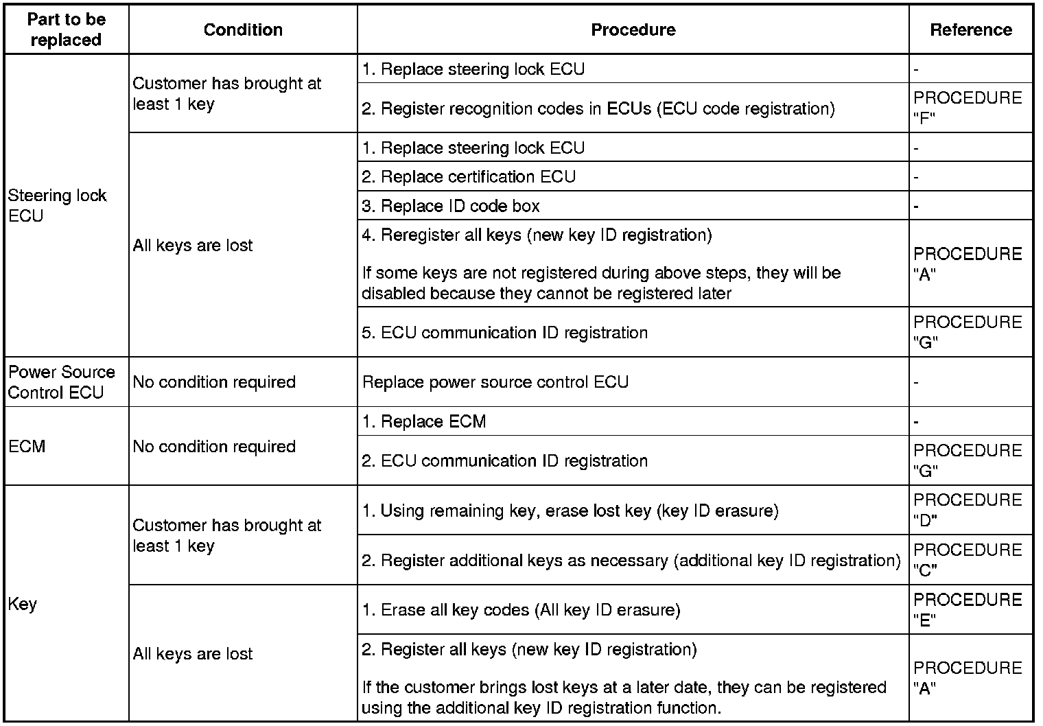 (a) The following table shows ECU replacement and key registration procedures in case the malfunctioning ECU has been specified after troubleshooting the smart key system.