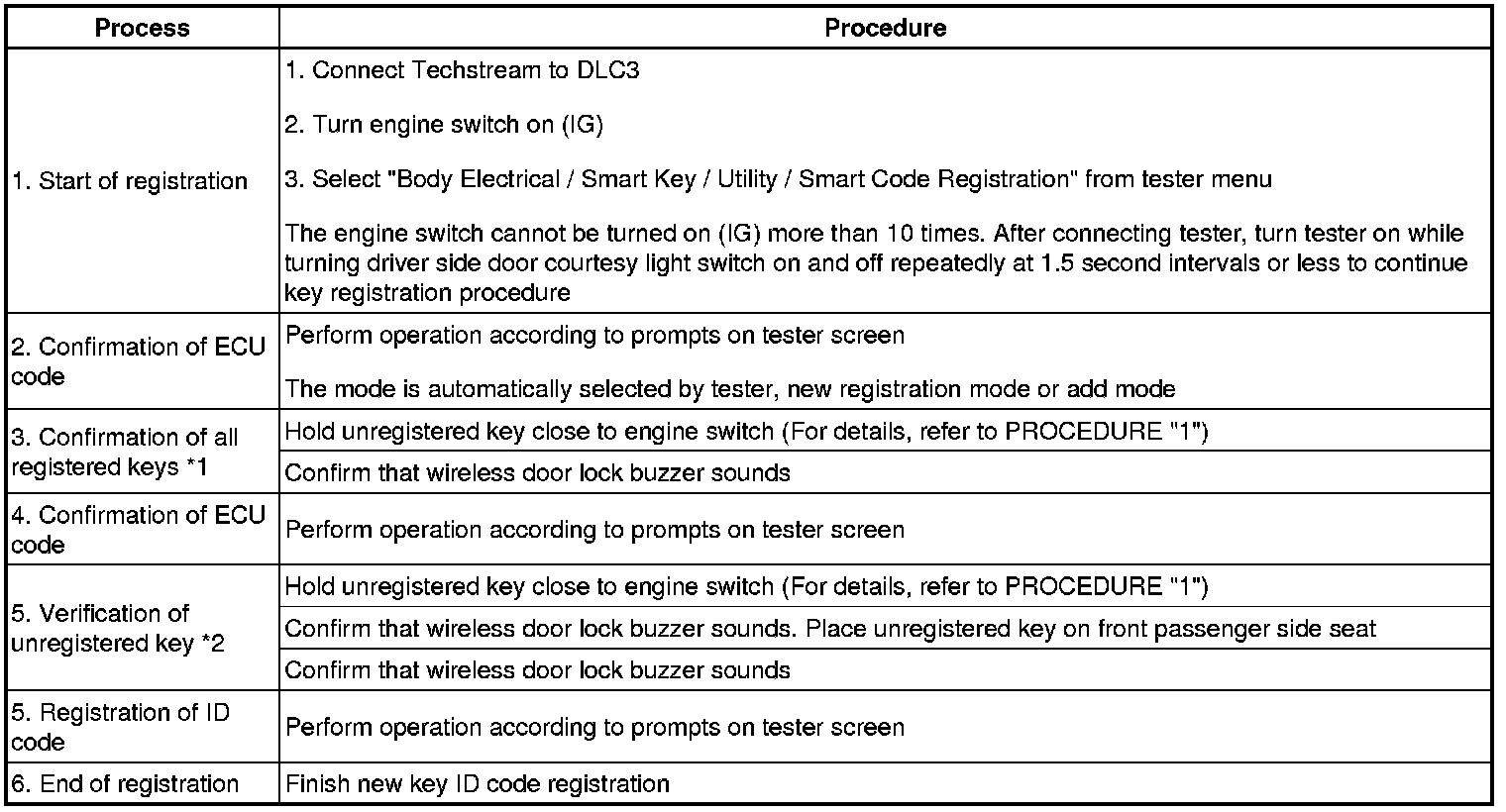 *1: Perform this process for one of the keys registered for the vehicle. Finish the procedure within 30 seconds. If the procedure has not been finished within the specified time, perform registration procedures from process 1 again.