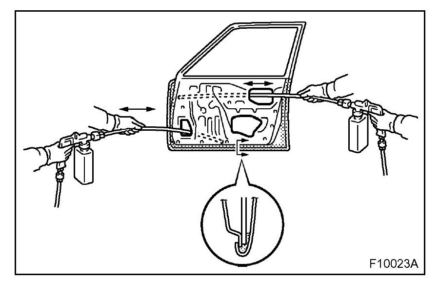 1. To preserve impossible to paint areas from corrosion, always apply sufficient anti-rust agent (wax) to the inside of the hemming areas of the doors and hoods, and around the hinges, or the welded surfaces inside the boxed cross-section structure of the side member, body pillar, etc.