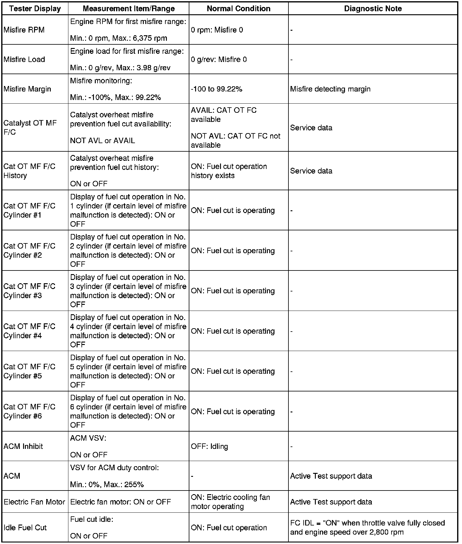 - *1: If the display of the Data List's Catalyst OT MF F/C item is Not Avl, perform this Active Test with the vehicle stopped and the engine idling.