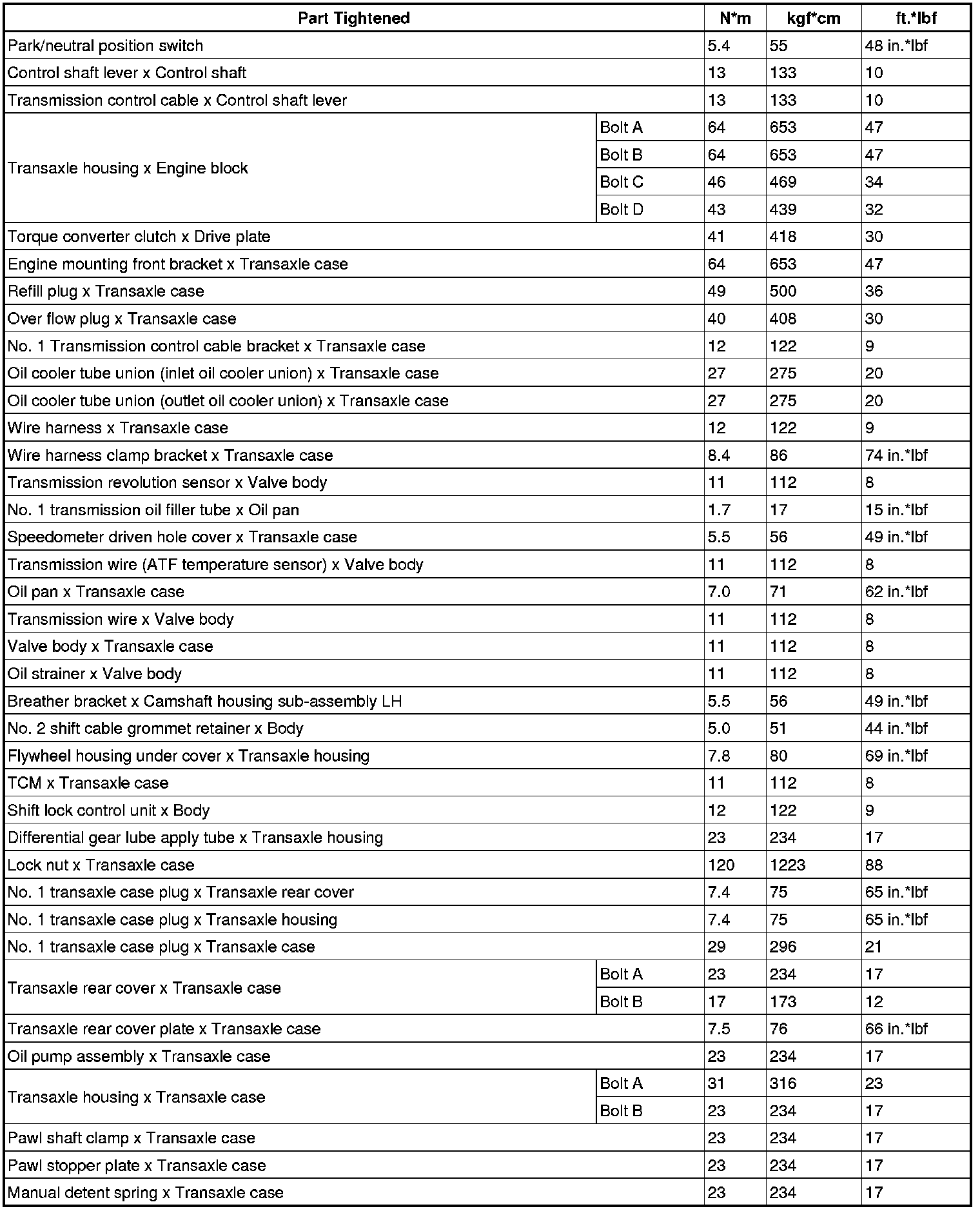 SERVICE SPECIFICATIONS: U660E AUTOMATIC TRANSAXLE: TORQUE SPECIFICATIONS