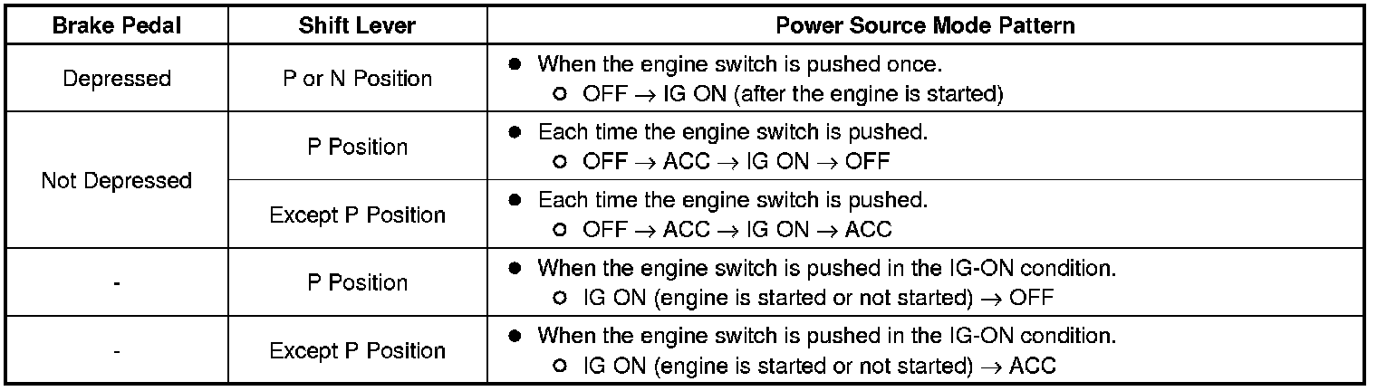 (h) After the buzzer sounds, if the engine switch is pressed within five seconds while the brake pedal is not depressed, the power source mode switches to ACC or IG, the same as in the normal condition.