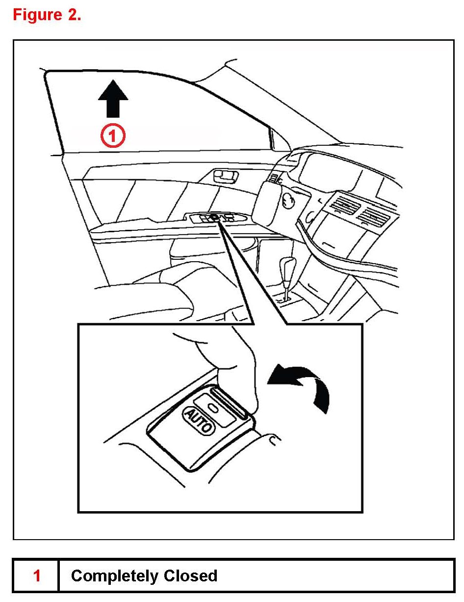 2. Pull and hold up the passenger's door power window switch until the window closes. Continue holding the switch until the switch changes from blinking to a constant illumination.