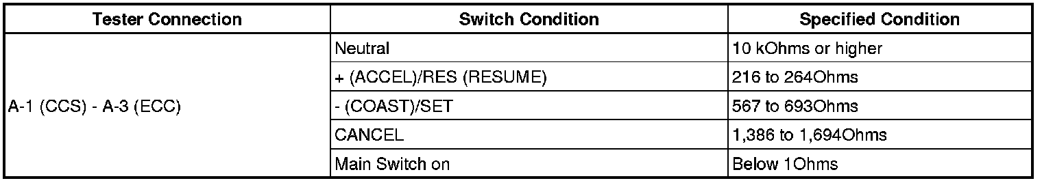 If the result is not as specified, replace the cruise control main switch