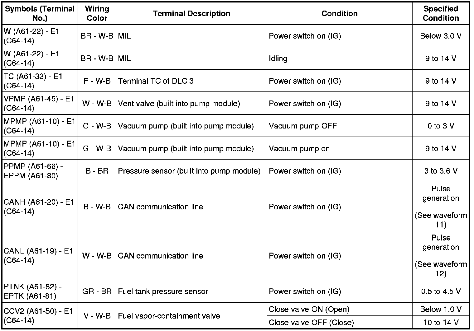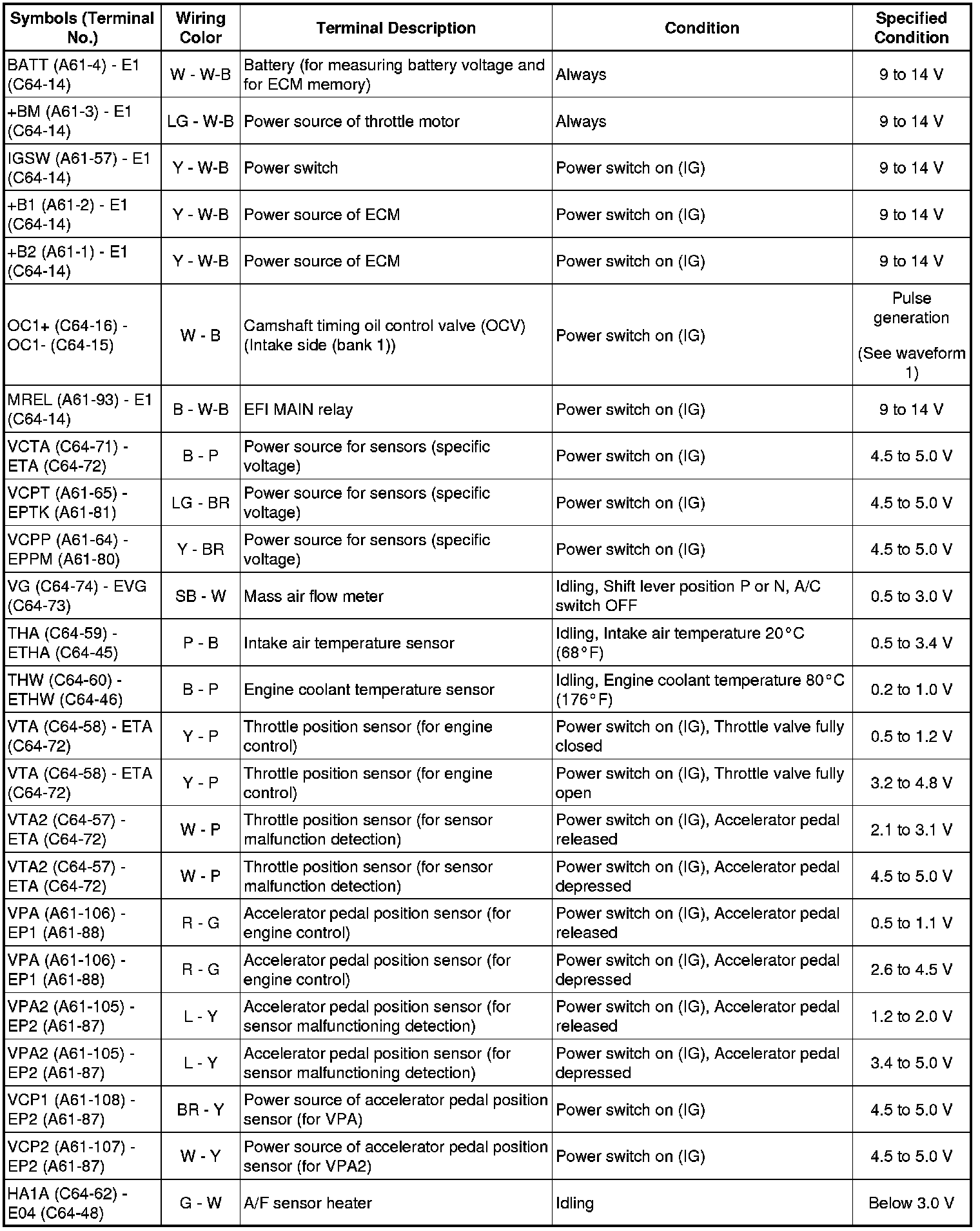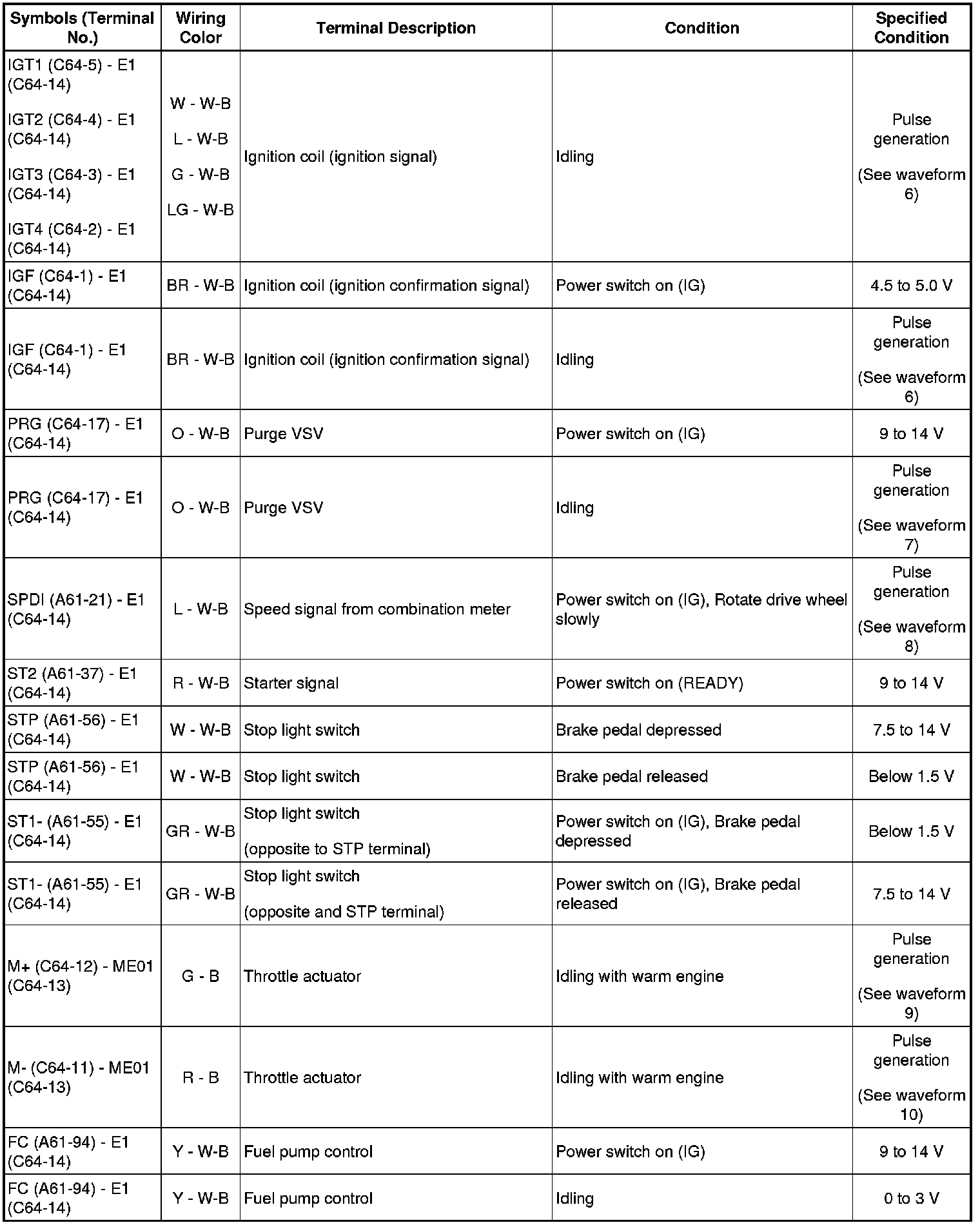 HINT: The standard normal voltage between each pair of the ECM (included in the hybrid vehicle control ECU) terminals is shown in the table below. The appropriate conditions for checking each pair of the terminals are also indicated. The result of checks should be compared with the standard normal voltage for that pair of the terminals, displayed in the "Specified Condition" column. The illustration above can be used as a reference to identify the ECM terminal locations.