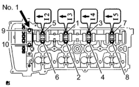 CYLINDER HEAD SUB-ASSEMBLYUsing several steps, uniformly install and tighten the 10 cylinder head set bolts and plate washers with a 10 mm bi-hexagon wrench in the order shown in the illustration.