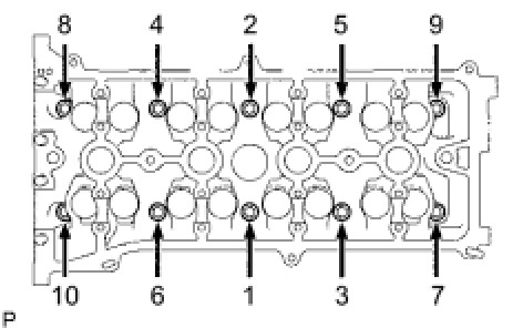 CYLINDER HEAD SUB-ASSEMBLYUsing several steps, uniformly install and tighten the 10 cylinder head set bolts and plate washers with a 10 mm bi-hexagon wrench in the order shown in the illustration.