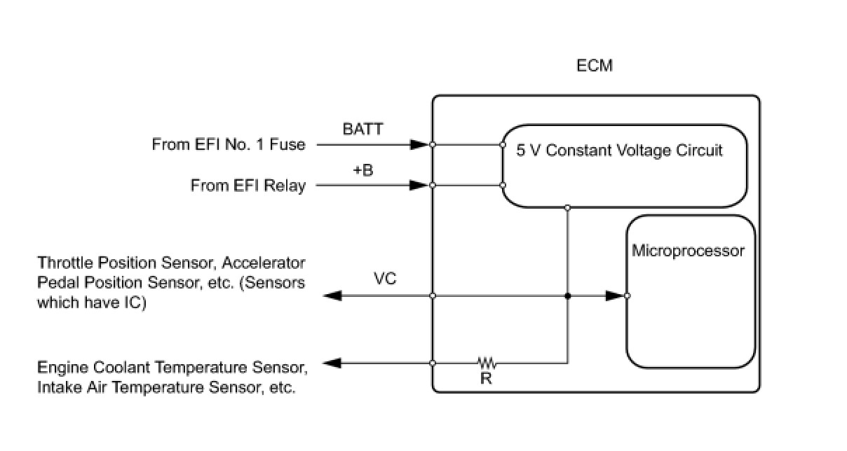 The ECM constantly uses 5 V from the battery voltages supplied to the +B (BATT) terminal to operate the microprocessor. The ECM also provides this power to the sensors through the VC output circuit.
