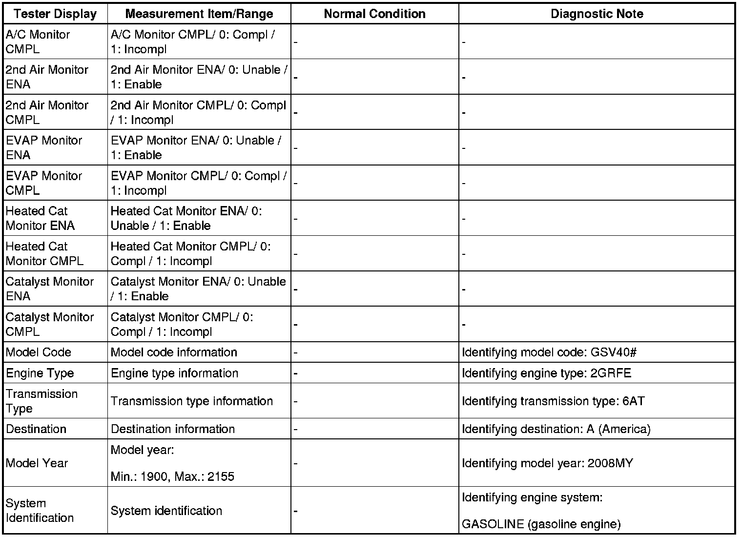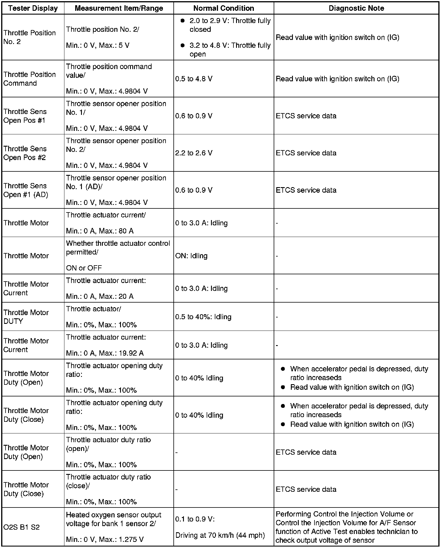 NOTICE: In the table below, the values listed under Normal Condition are reference only. Do not depend solely on these values when determining whether or not a part is faulty.