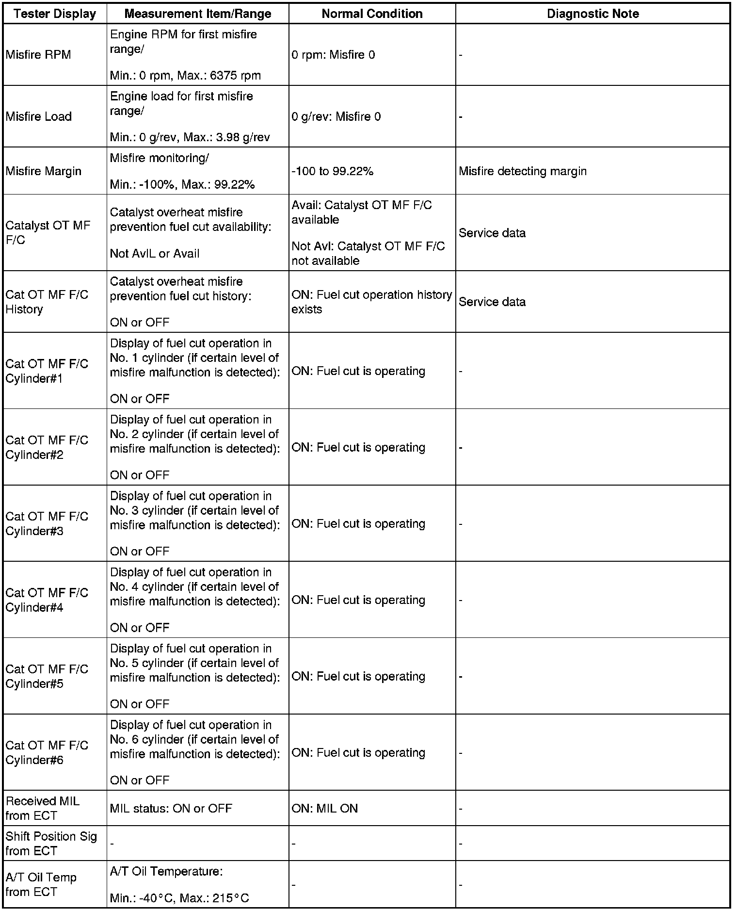 NOTICE: *1: If the display of the Data List's Catalyst OT MF F/C item is Not Avl, perform this Active Test with the vehicle stopped and the engine idling. If the display of the Data List's Catalyst OT MF F/C item is Avail, perform this Active Test as described below.