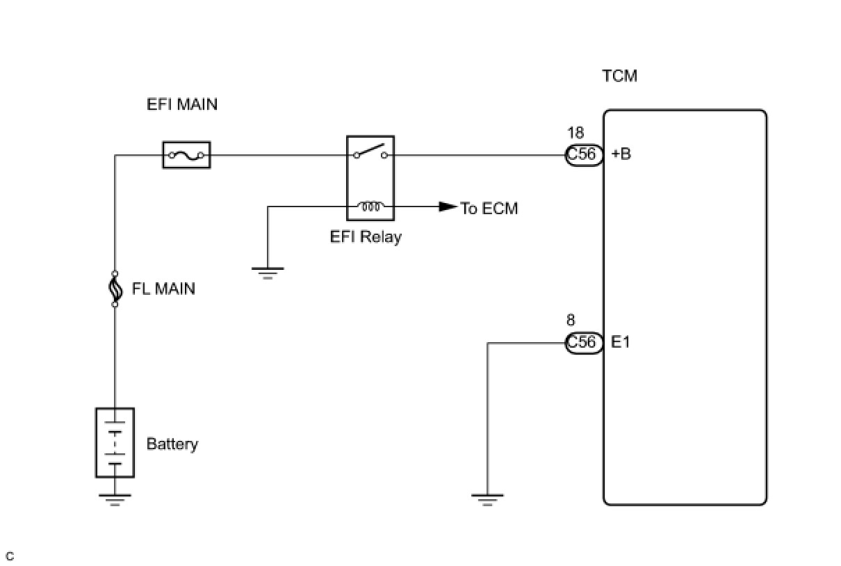 When the ignition switch is turned on (IG), voltage from the ECM's MREL terminal is applied to the EFI relay. This causes the contacts of the EFI relay to close, which supplies power to terminal +B of the TCM.
