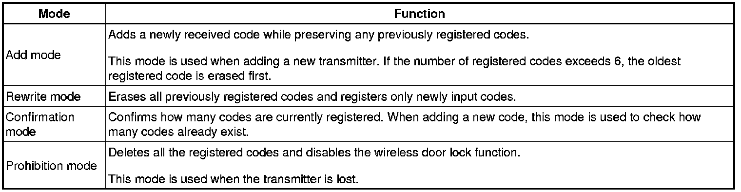 The table below shows the 4 ID registration function modes by which up to 6 different codes can be registered. The codes are electronically registered (written and stored) in the EEPROM that is contained in the door control receiver.