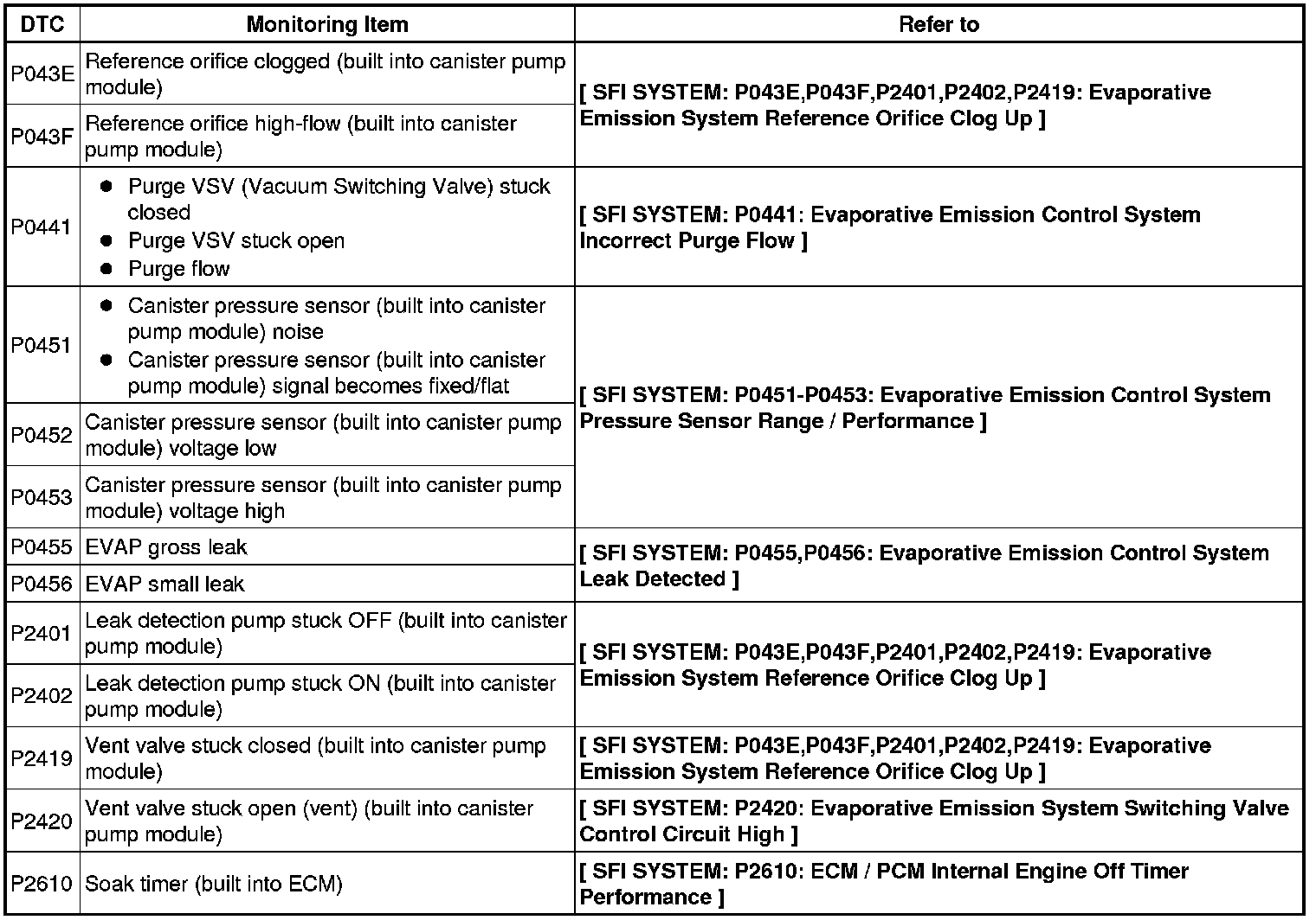 If any EVAP system DTCs are set, the malfunctioning area can be determined using the table below.