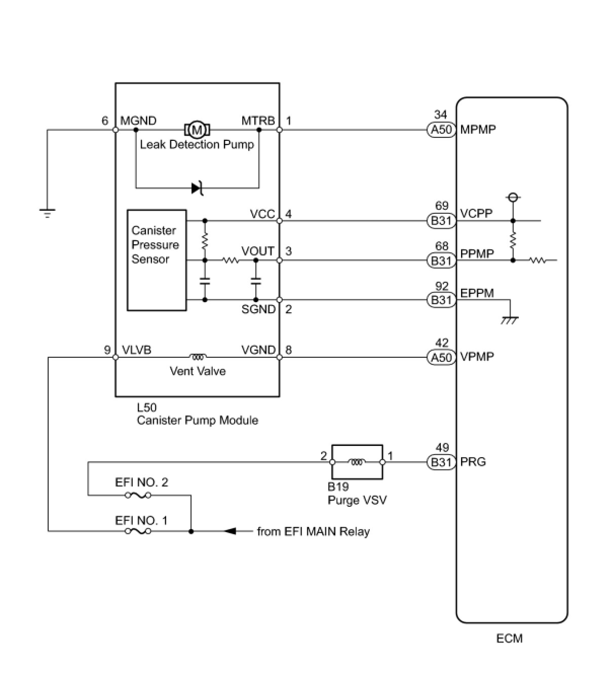 The leak detection pump creates negative pressure (vacuum) in the EVAP system and the pressure is measured. Finally, the ECM monitors for leaks from the EVAP system, and malfunctions in both the canister pump module and purge VSV, based on the EVAP pressure.