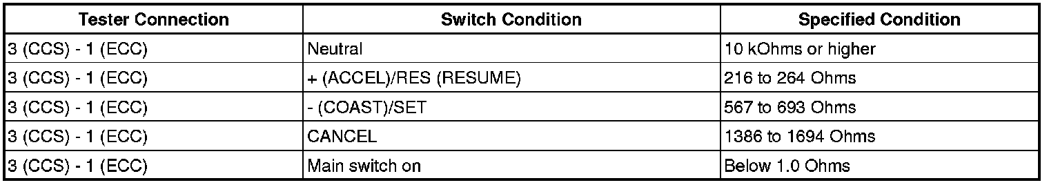 If the result is not as specified, replace the cruise control main switch.