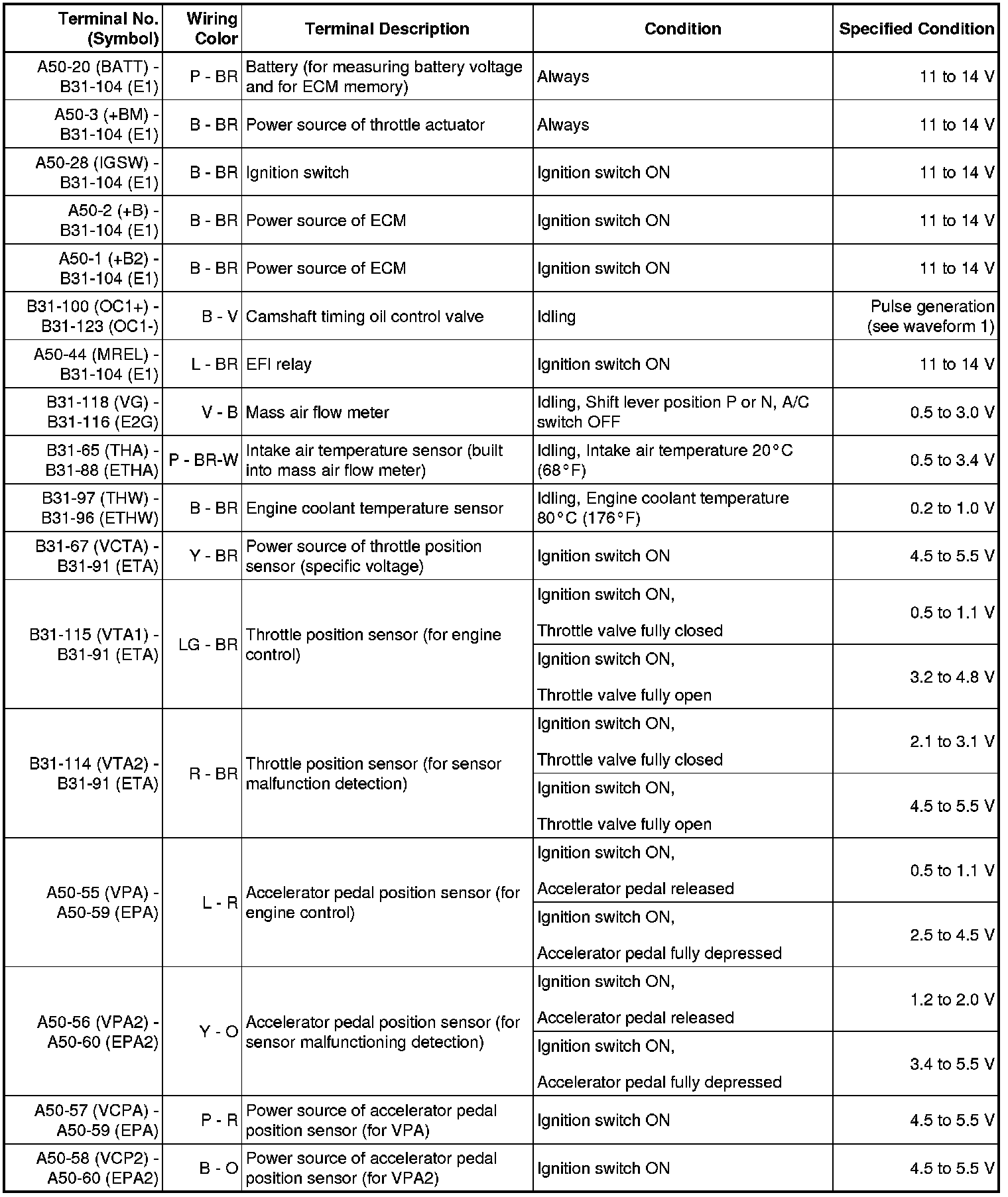 HINT: The standard normal voltage between each pair of ECM terminals is shown in the table below. The appropriate conditions for checking each pair of terminals are also indicated. The result of checks should be compared with the standard normal voltage for that pair of terminals, displayed in the Specified Condition column. The illustration above can be used as a reference to identify the ECM terminal locations.