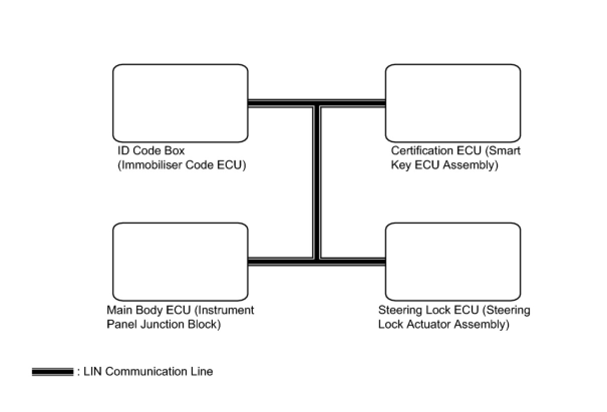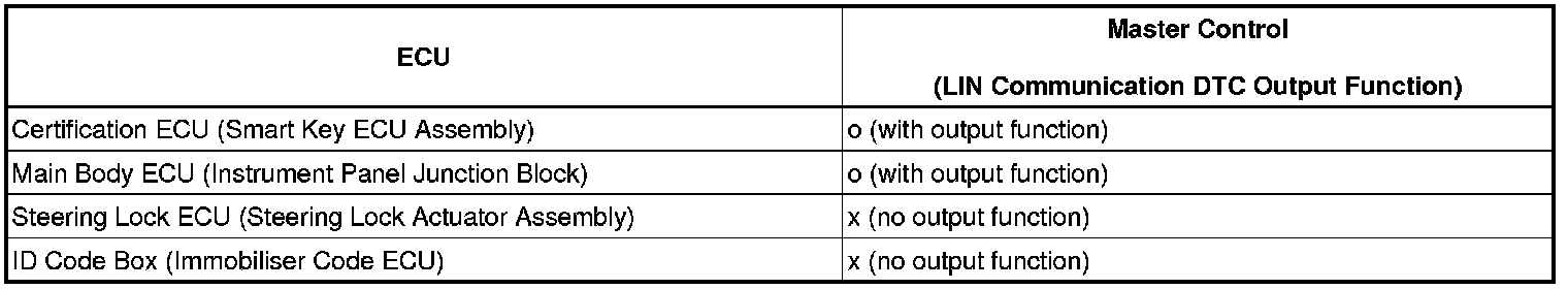 The multiplex communication system (LIN) is used to control communication between the ECUs of the body system. If communication cannot be performed through the LIN because of an open in the communication lines or other reason, the master control ECU of the relevant system will output a DTC. For the communication system and the connected ECUs, refer to the table below.