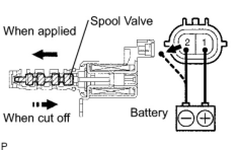 (1) Connect a positive (+) battery lead to terminal 1 and a negative (-) lead to terminal 2, and check the movement of the valve.
