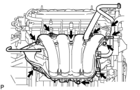 (d) Remove the 5 bolts, 2 nuts and intake manifold.