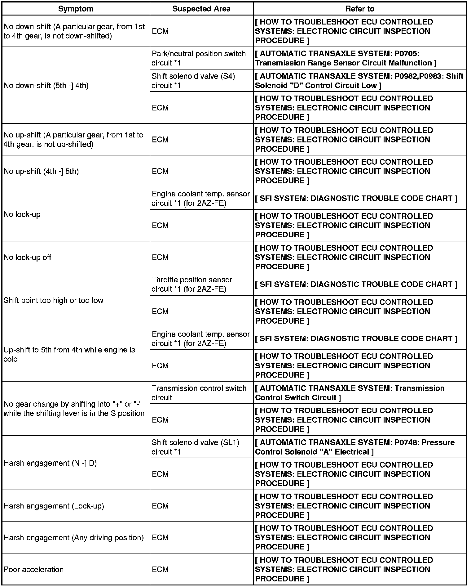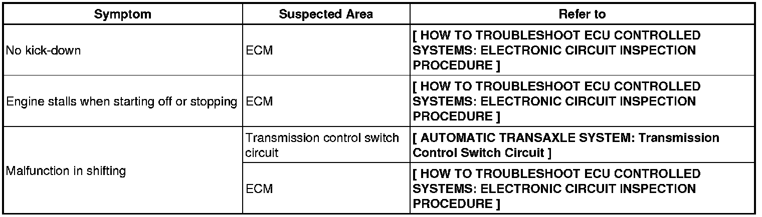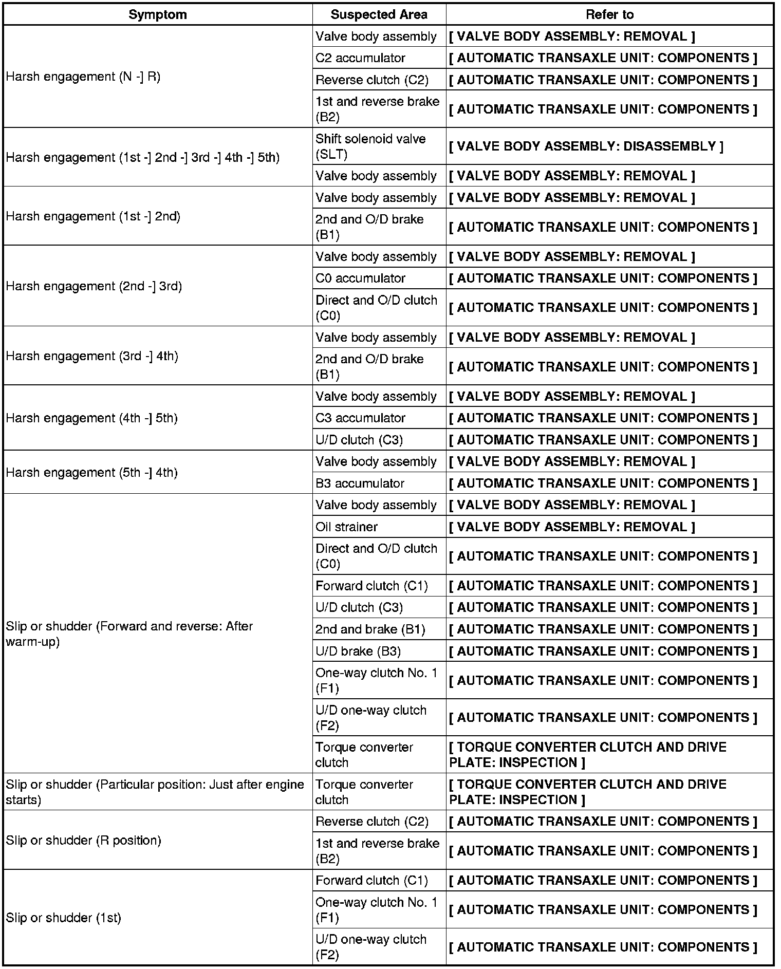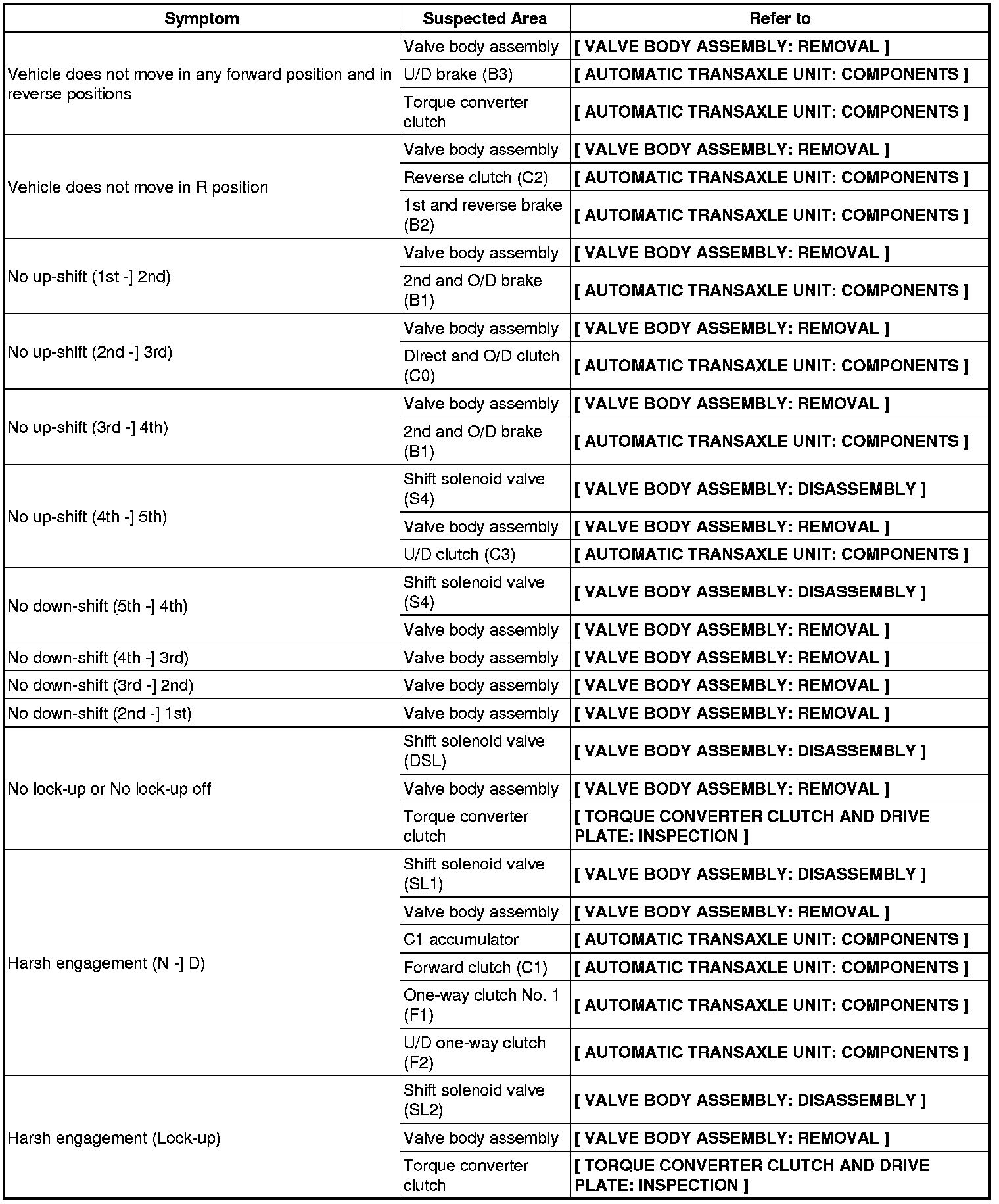 U250E AUTOMATIC TRANSMISSION / TRANSAXLE: AUTOMATIC TRANSAXLE SYSTEM: PROBLEM SYMPTOMS TABLE