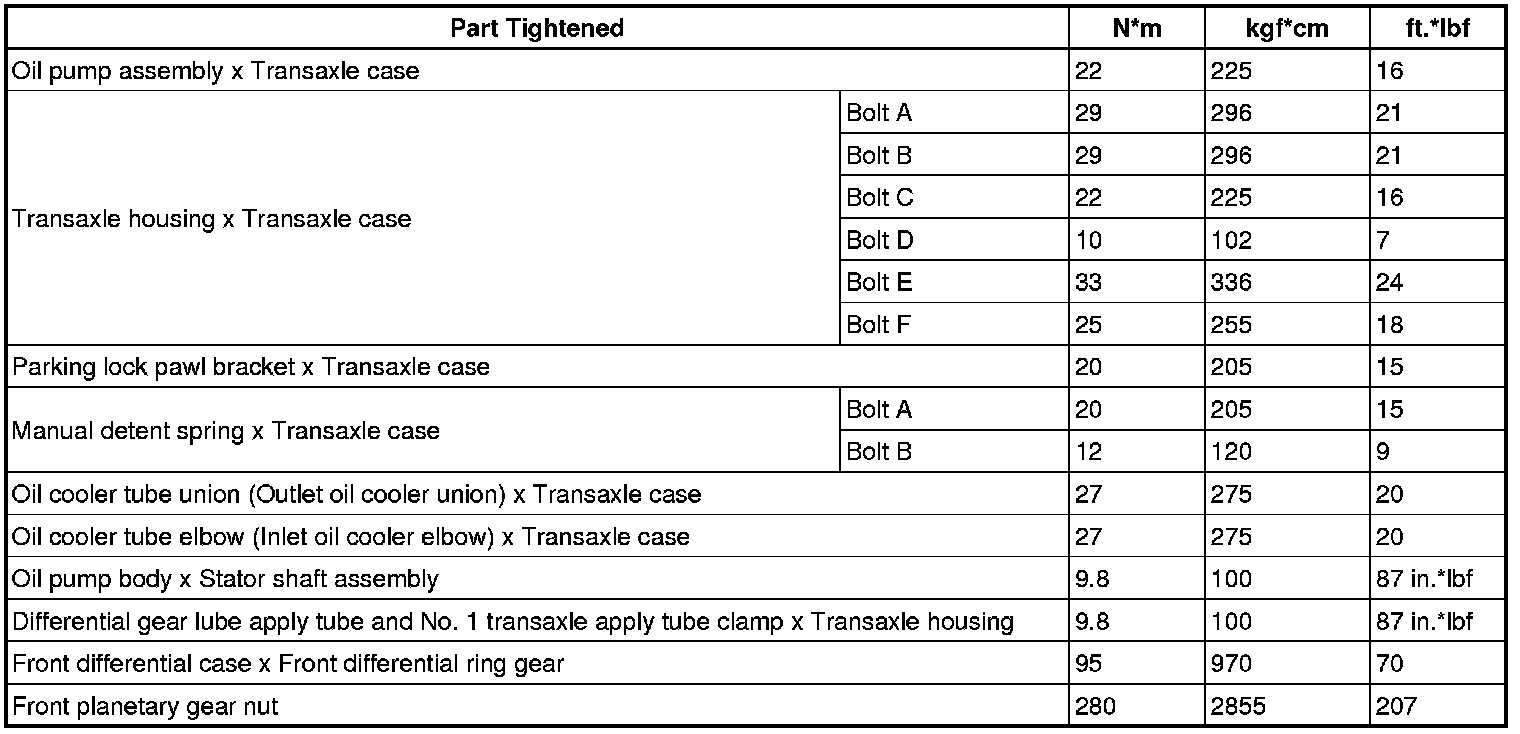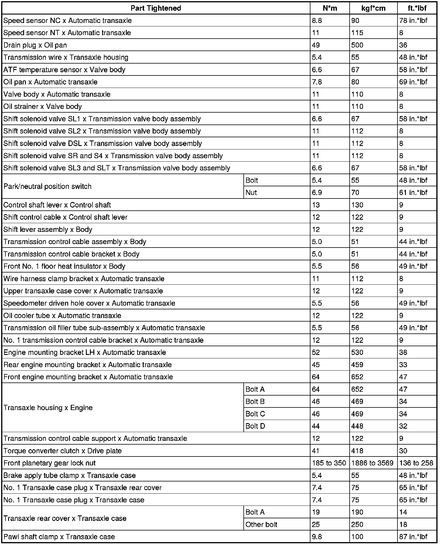 SPECIFICATIONS: U250E AUTOMATIC TRANSMISSION / TRANSAXLE: TORQUE SPECIFICATIONS