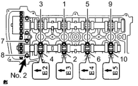 CYLINDER HEAD SUB-ASSEMBLYUsing several steps, uniformly install and tighten the 10 cylinder head set bolts and plate washers with a 10 mm bi-hexagon wrench in the order shown in the illustration.