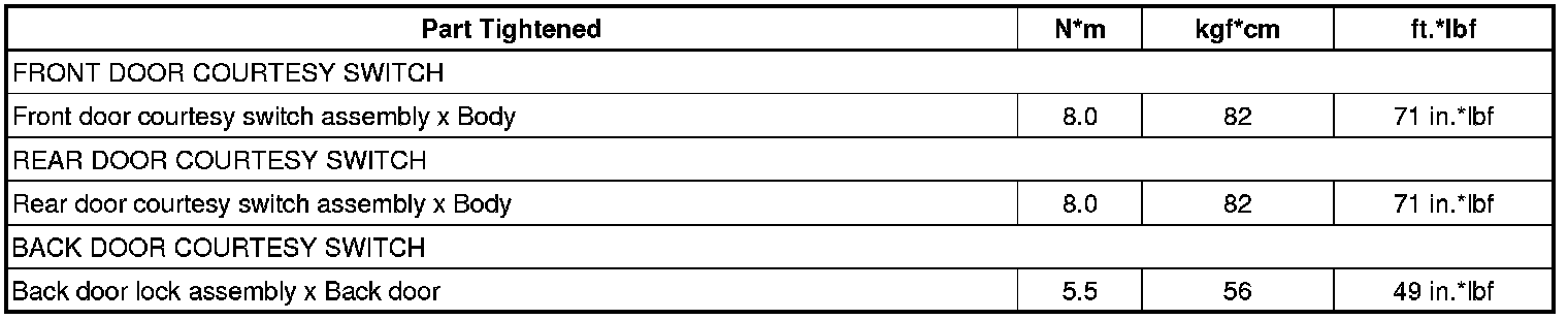 SPECIFICATIONS: LIGHTING (INT): TORQUE SPECIFICATIONS