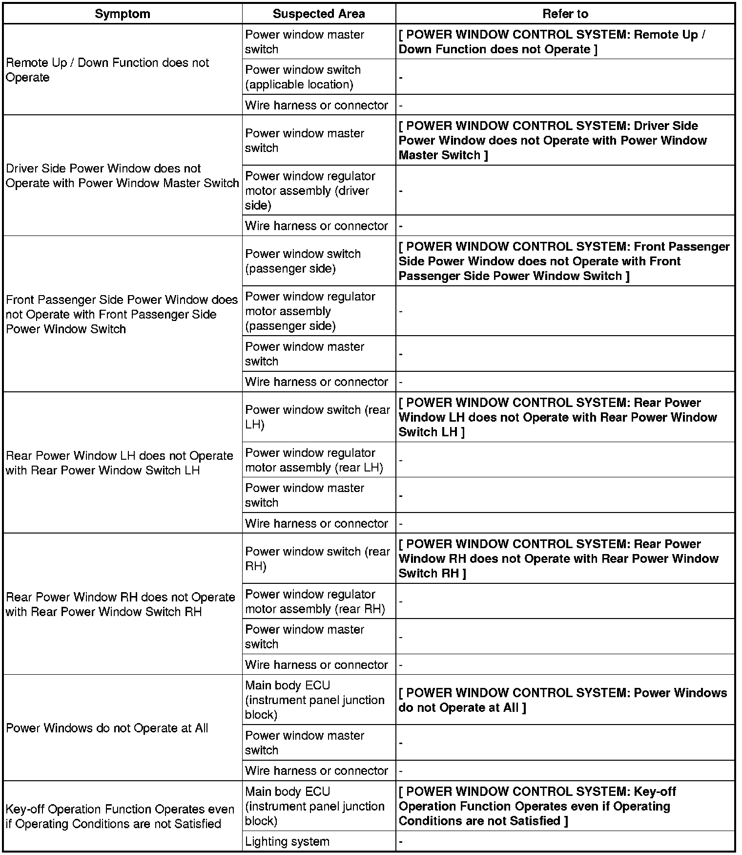 WINDOW / GLASS: POWER WINDOW CONTROL SYSTEM: PROBLEM SYMPTOMS TABLE