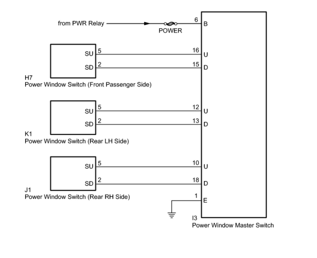 With the ignition switch ON, the power window master switch transmits remote switch signals to the switches of the front passenger door power window and rear door power windows. Then, each regulator switch drives its respective power window regulator motor.
