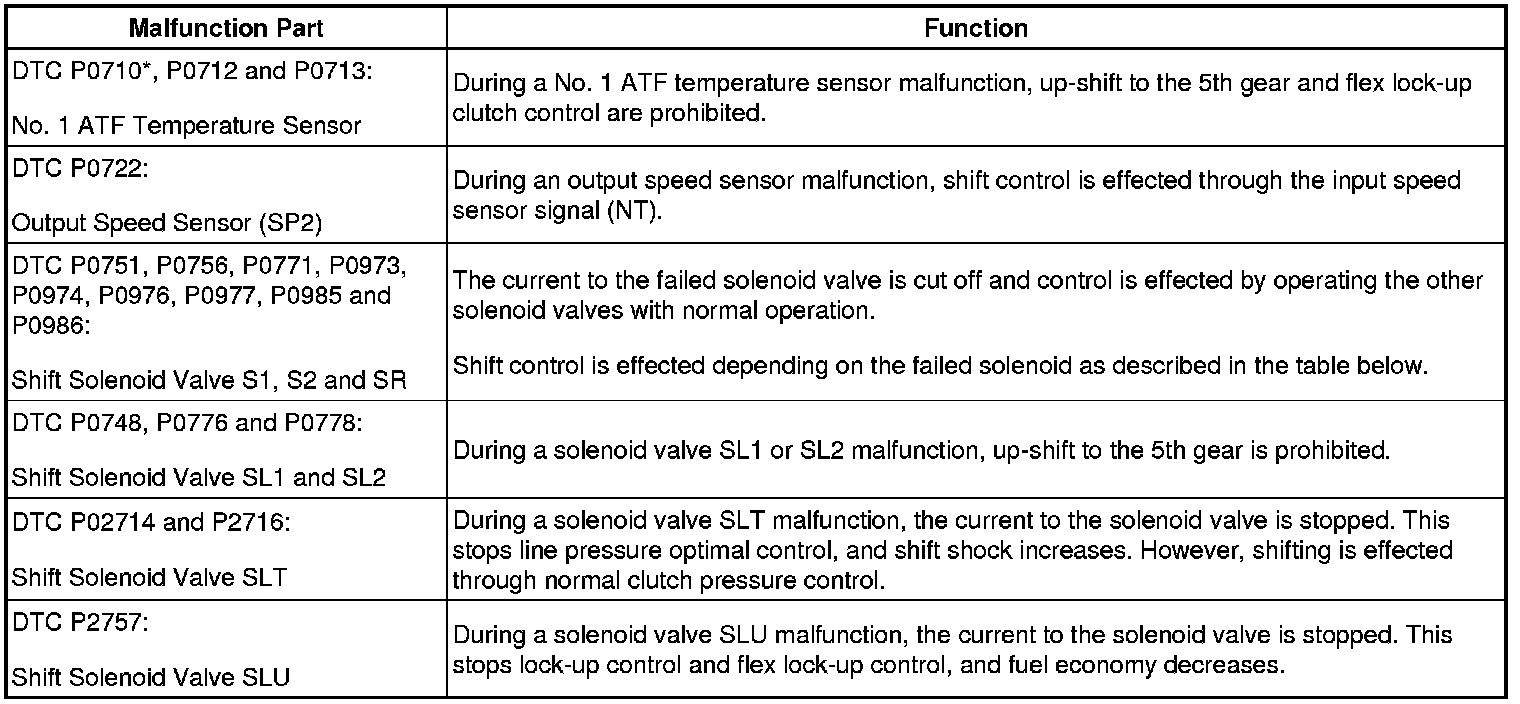 If either of the shift solenoid valve circuits has an open or short failure, the ECM turns the other shift solenoid ON and OFF in order to shift into the gear positions shown in the table below.