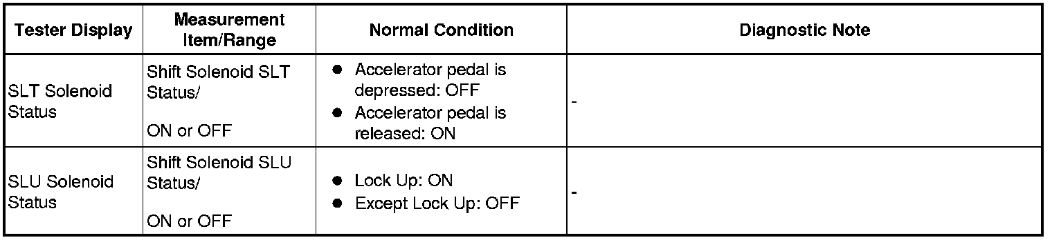 *: Active the Solenoid (SLT) in the Active Test is performed to check the line pressure changes by connecting SST to the automatic transmission, which is used in the HYDRAULIC TEST Hydraulic Test as well. Please note that the pressure values in the Active Test and HYDRAULIC TEST are different.