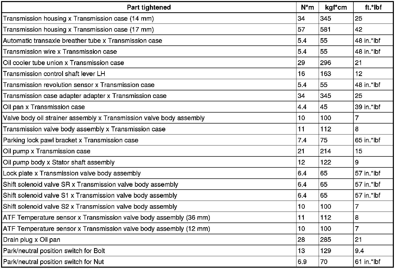 SERVICE SPECIFICATIONS: A750F AUTOMATIC TRANSMISSION: TORQUE SPECIFICATIONS