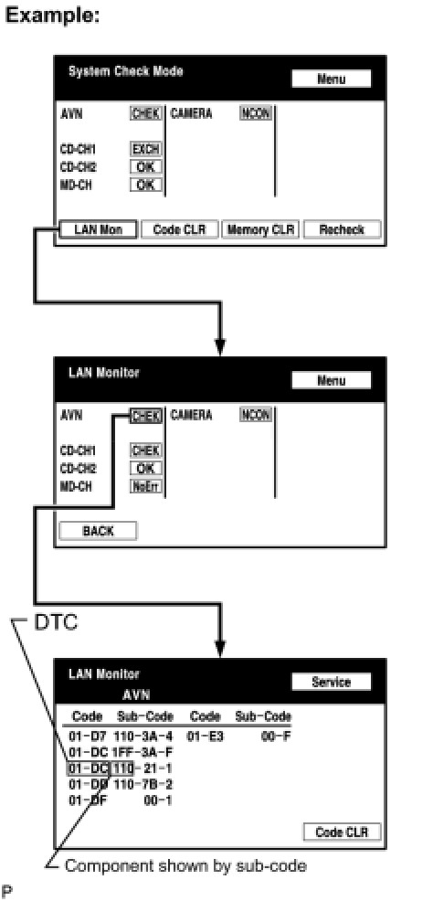 (2) Check for an open or short in the AVC-LAN circuit between the navigation receiver assembly and the component shown by the sub-code.