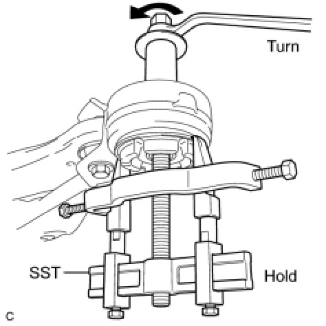 (a) Using SST, remove the front suspension member body mounting rear cushion LH.