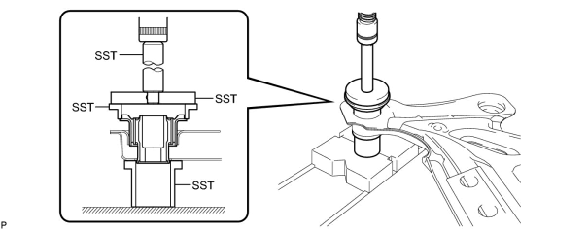 (b) Using SST and a press, install the rear suspension member body mounting rear cushion (LH side) to the rear suspension member sub-assembly.