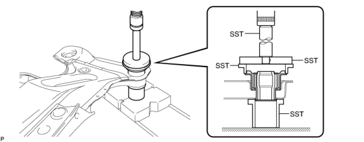 (b) Using SST and a press, install the rear suspension member body mounting front cushion LH to the rear suspension member sub-assembly.