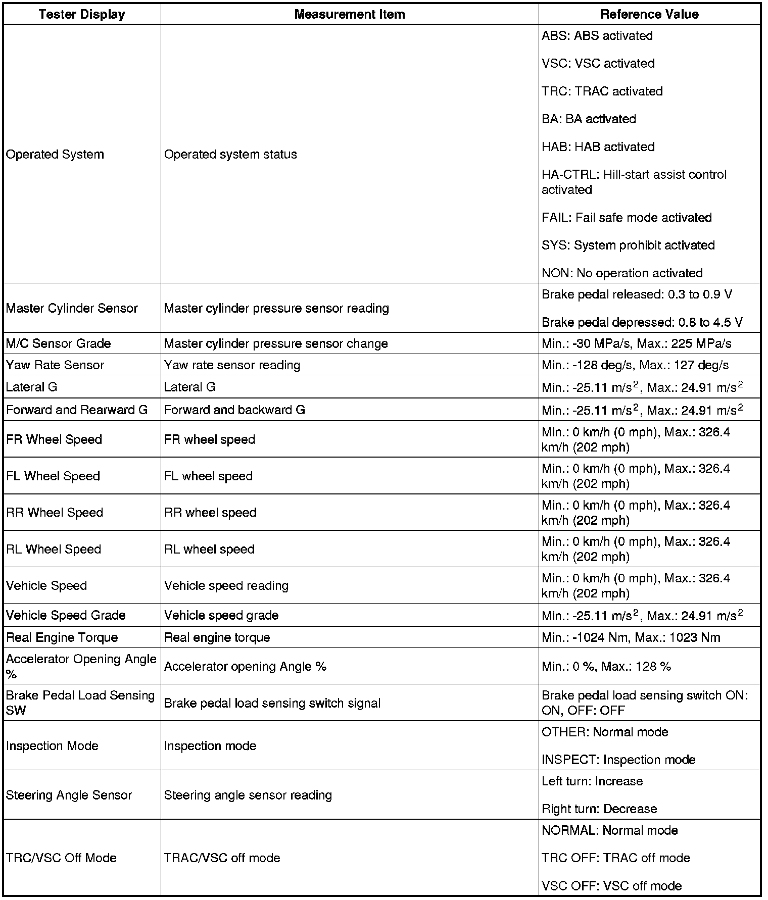 - Freeze Frame Data at the time the ABS operates: