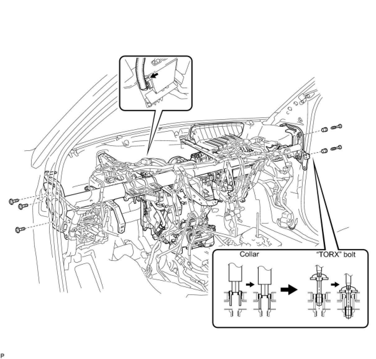 (2) Using a "TORX" socket wrench (T40), install the instrument panel reinforcement assembly with the 2 "TORX" bolts.