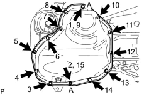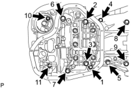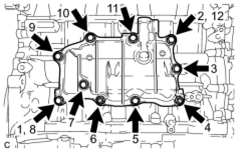 (b) Install the oil pan by tightening the 11 bolts and 2 nuts in several steps, in the sequence shown in the illustration.