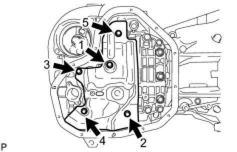 (a) Install the oil pan baffle plate and uniformly tighten the 5 bolts in several steps, in the sequence shown in the illustration.