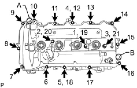(e) Align the cylinder head cover with pin A. Then align the cylinder head cover with pin B and install the cylinder head cover.