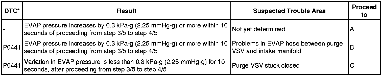 The vent valve is turned OFF (open) and the EVAP pressure is then measured. If the variation in the pressure is less than 0.5 kPa-g (3.75 mmHg-g), the ECM interprets this as the purge VSV being stuck closed, and illuminates the MIL and sets DTC P0441 (2 trip detection logic).